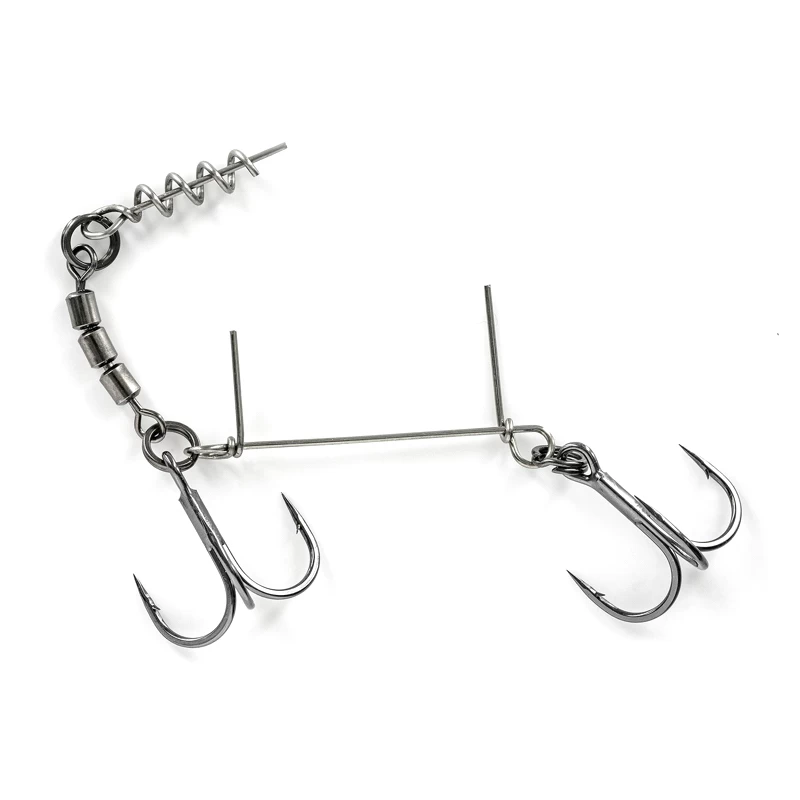 Es hat ein einfaches Schraubsystem für die Spitze und 2 Stifte, die mit einem langen und starken Arm realisiert wurden, mit dem das Rig am Bauch oder am Rücken des Köders befestigt werden kann. Der hochwertige Dreifachwirbel sorgt für einen reibungslosen Ablauf und reduziert die Probleme beim Aushaken während des Fischfangs.